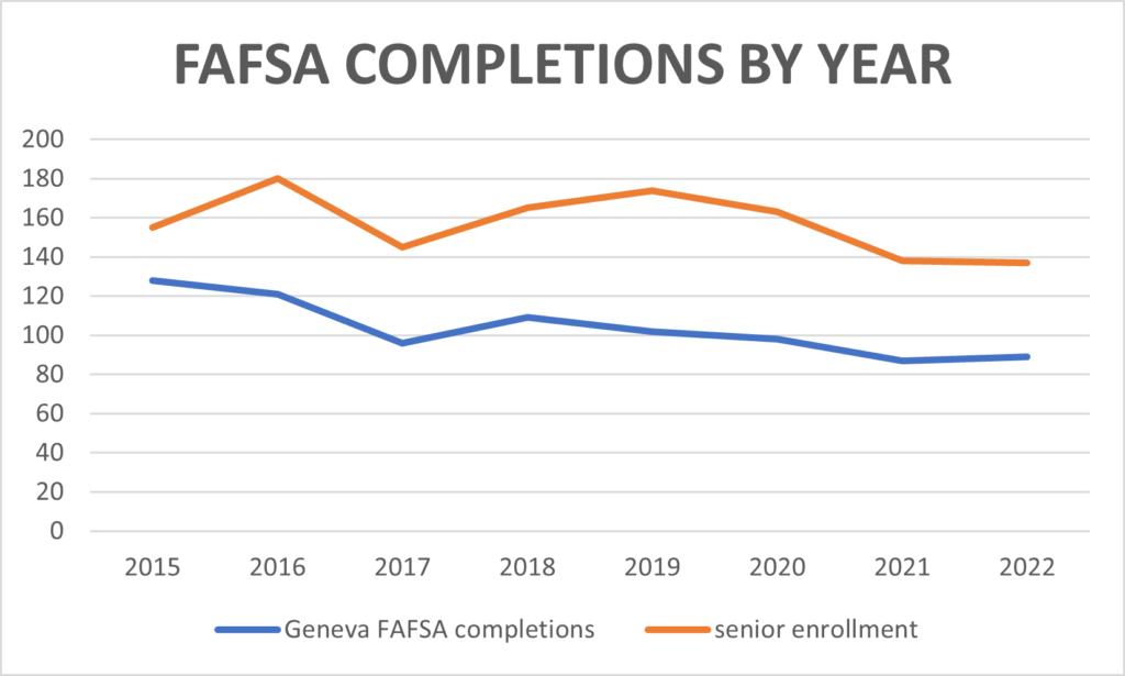 The number of Geneva High School students applying for federal aid for college has dropped fairly steadily for the last eight years. But so has the size of the senior class. The percentage has remained pretty static from year to year, hovering from 58.6% in 2019 to 67.2% in 2016. In 2022, about two-thirds of the class – 65% – submitted FAFSA applications.